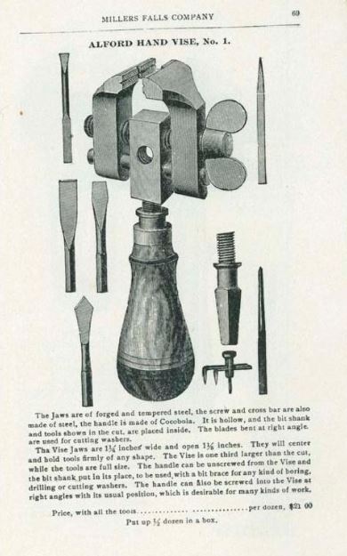 Ahh, I see the threaded brace adapter is missing from mine. I bought the hand vice used many years ago, and its one of the tools I use quite often as I have some difficulty with holding very small items due to arthritis in my hands.millers falls catelogues shows your one which has a distinct black end wood to be from its 1908 edition