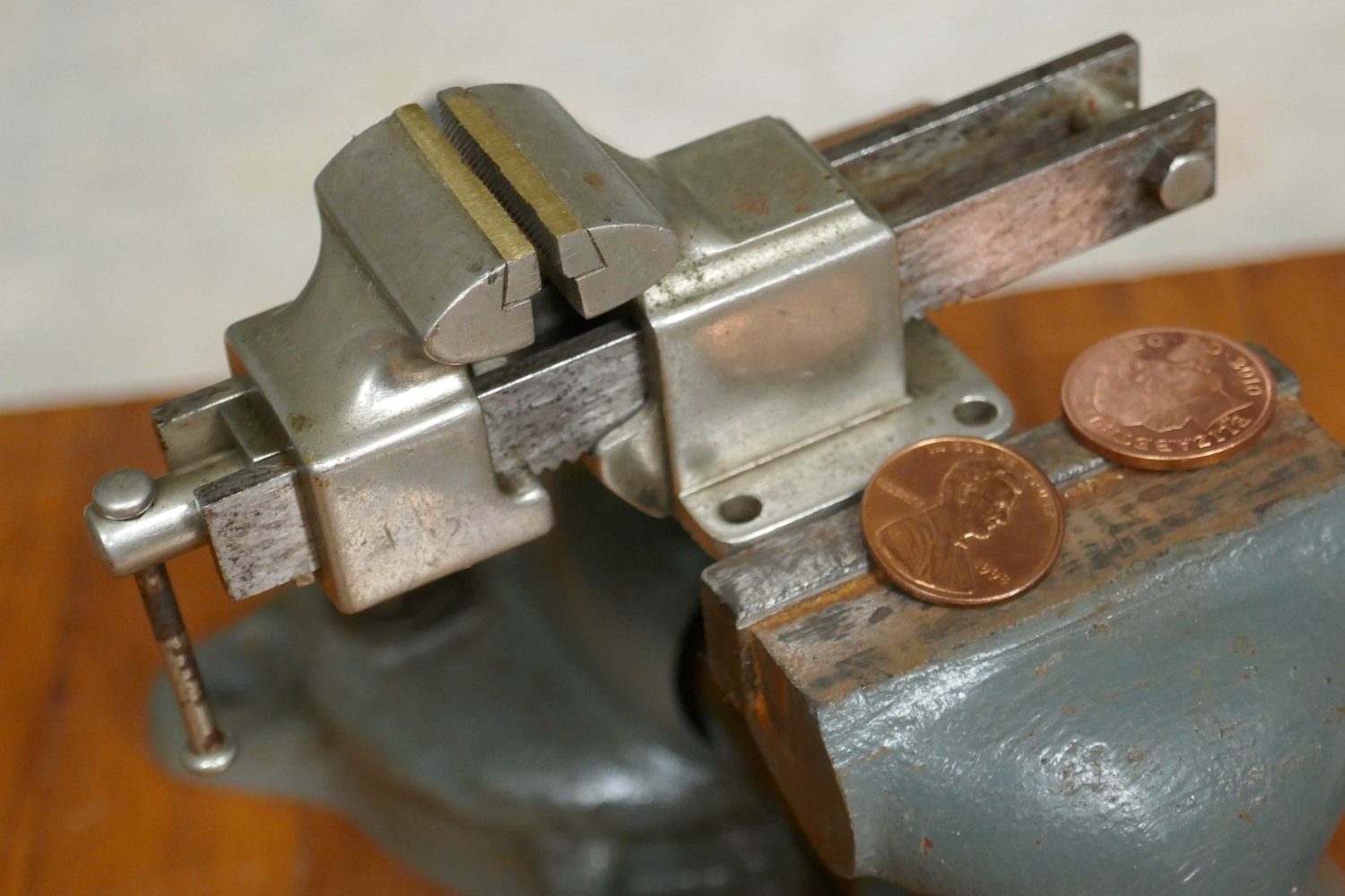 sitting on a 60mm swivel York 'bullet' just over 1in wide jaws and 9oz, Lincoln and QEII pennies for scale