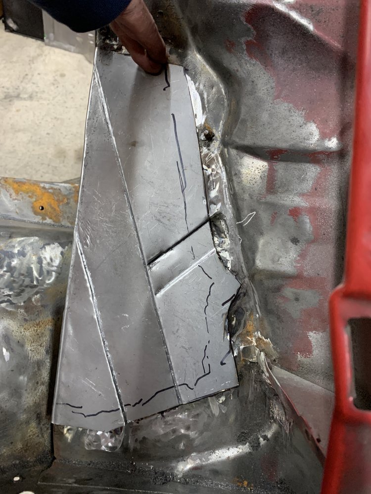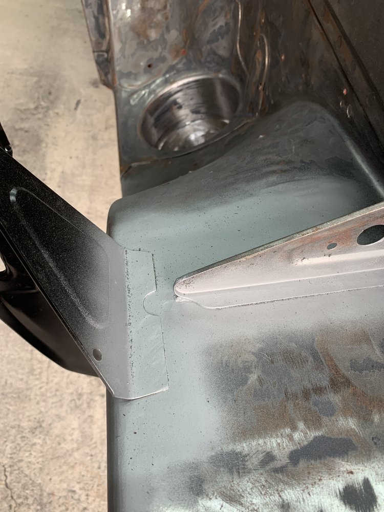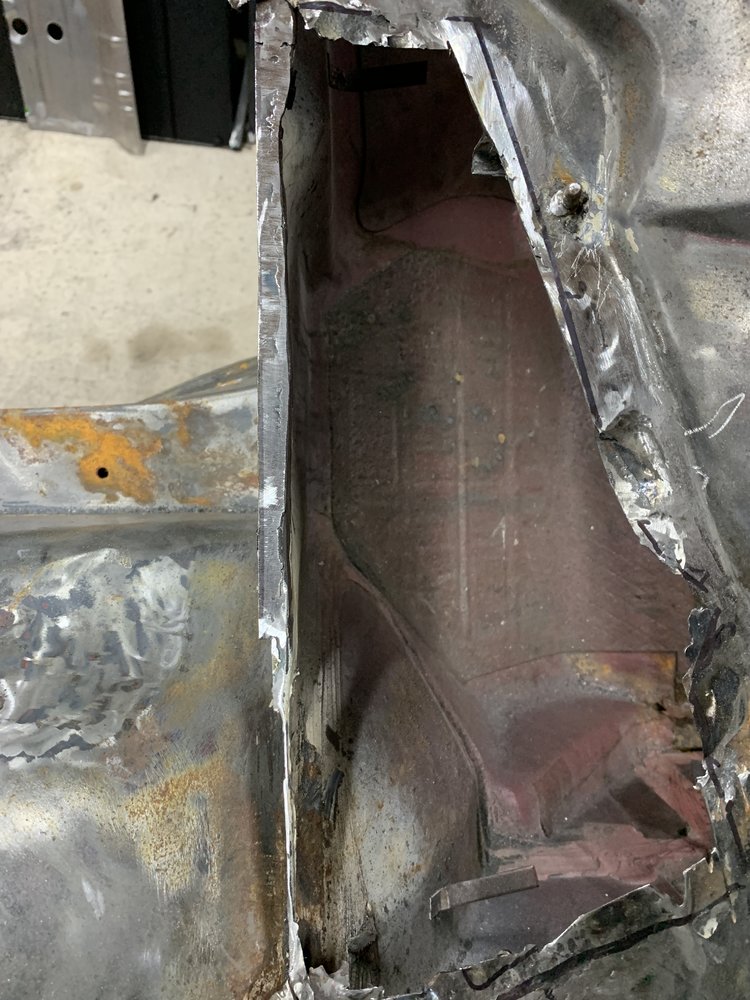 Started by fitting the centre sill temporarily as I had a feeling stuff wasn't just going to fit. I was right. Just clamped it and then tried to fit the outer sill, not a chance. Slightly loosened all the mole grips so I could tap it all into place with a hide mallet. There is a good 3/8" of the centre sill that needs to be trimmed off. You can see it hanging down in this photo.