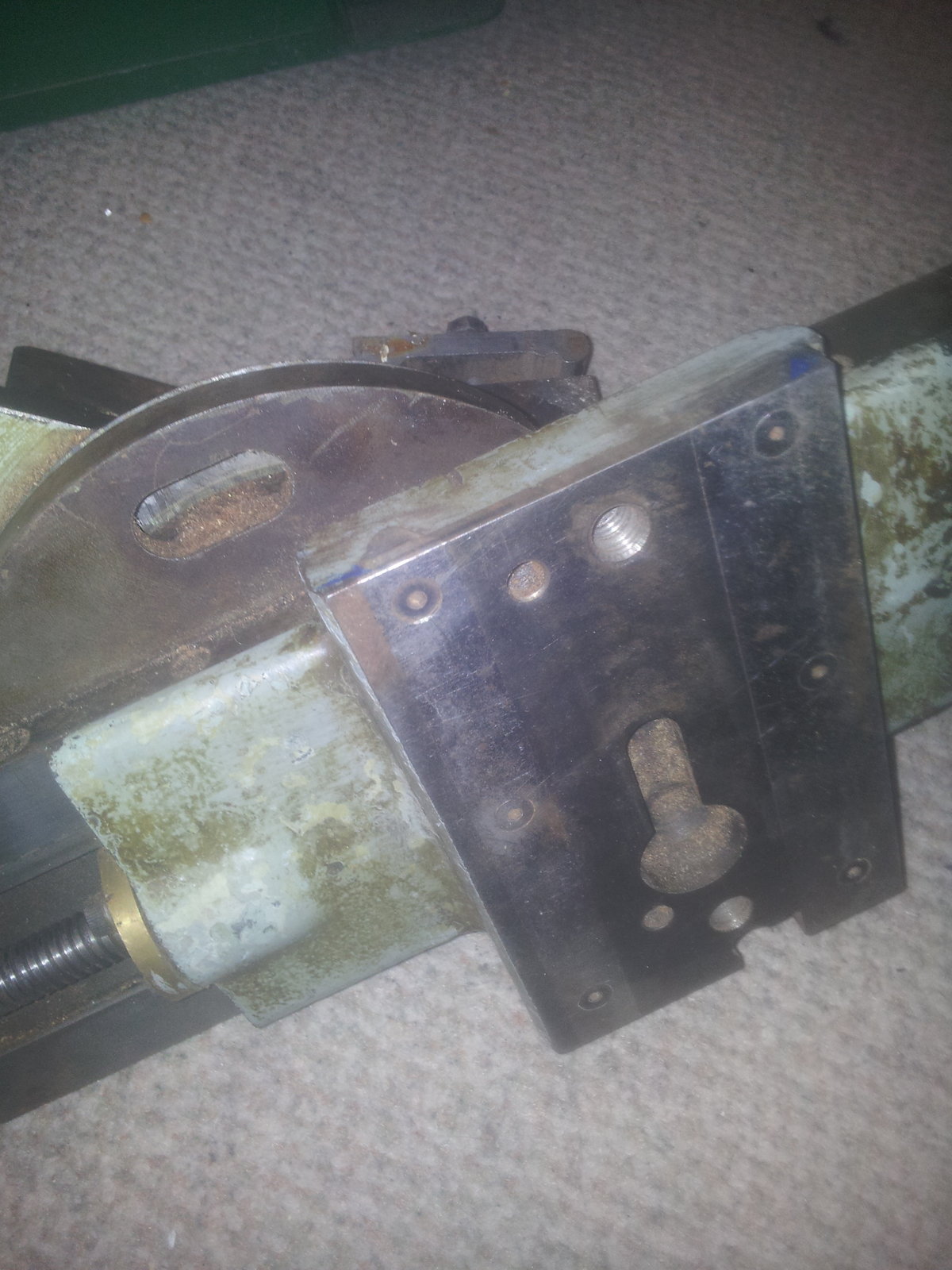 The lathes plain turning so the saddle comes off with a few turns of a tap head underneath and the bolt slides out of a keyhole under the saddle. Guessing someone dropped it when removing.