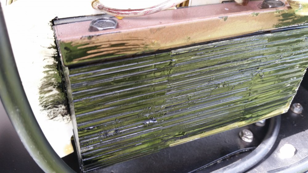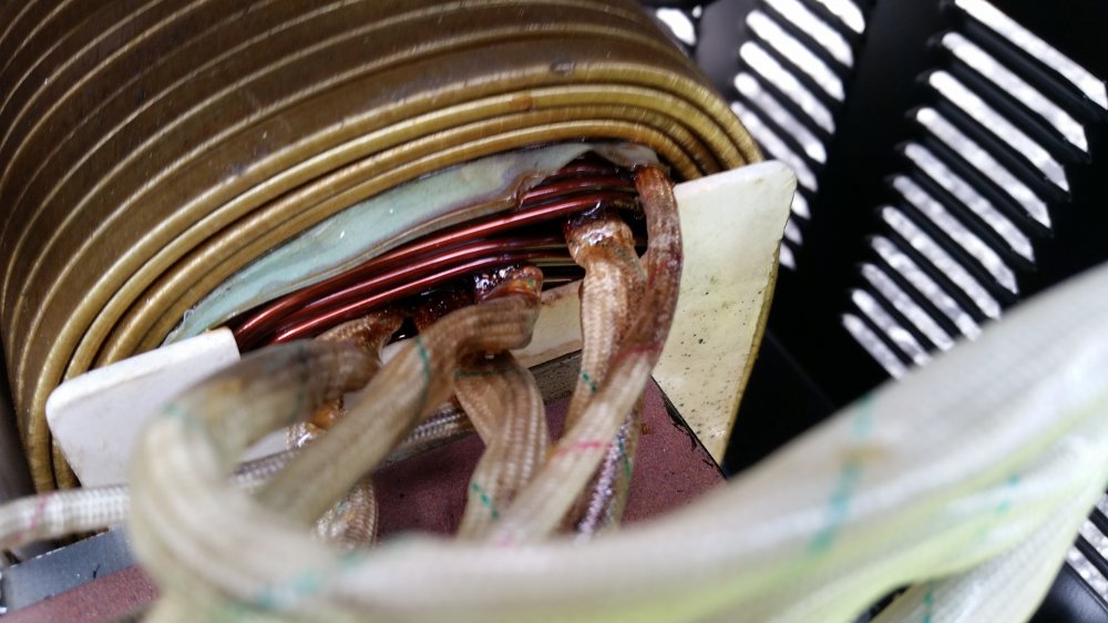 I have since taken both covers off to see. Last time I tried I did hear a gentle hiss which I thought would be a blown capacitor. But the larger CAPS (6 of them) look fine. The transformer is odd though. It's huge! The steel plates appear to be painted black or have black gunk on them. A thin layer of metal seems to be separating from the base support of the transformer due to heat perhaps. Aside from this I don't see anything else but afraid to use it.
