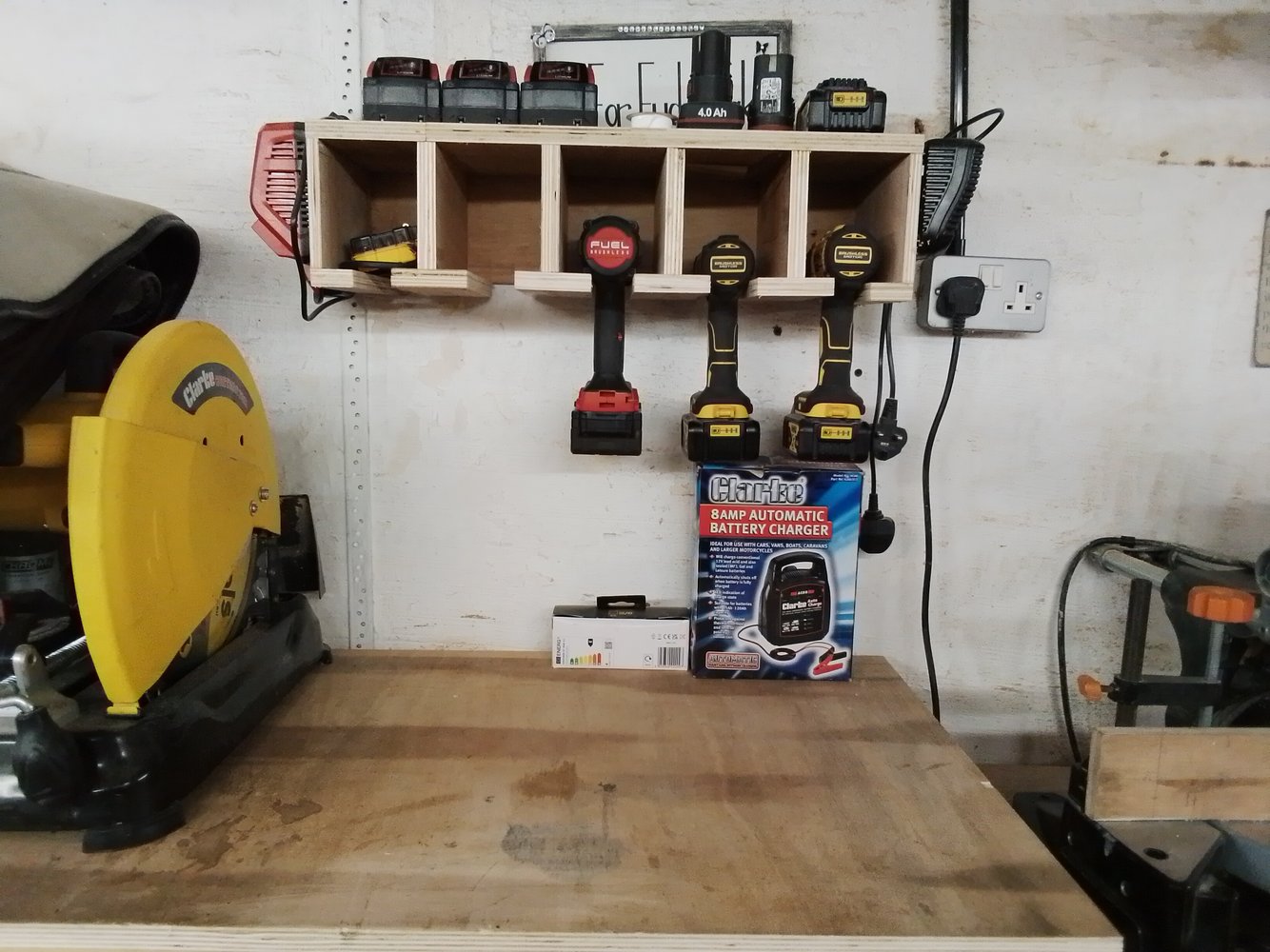 Above the bench is a charging station made outof offcuts of 3/4" ply that keeps it all in one place: