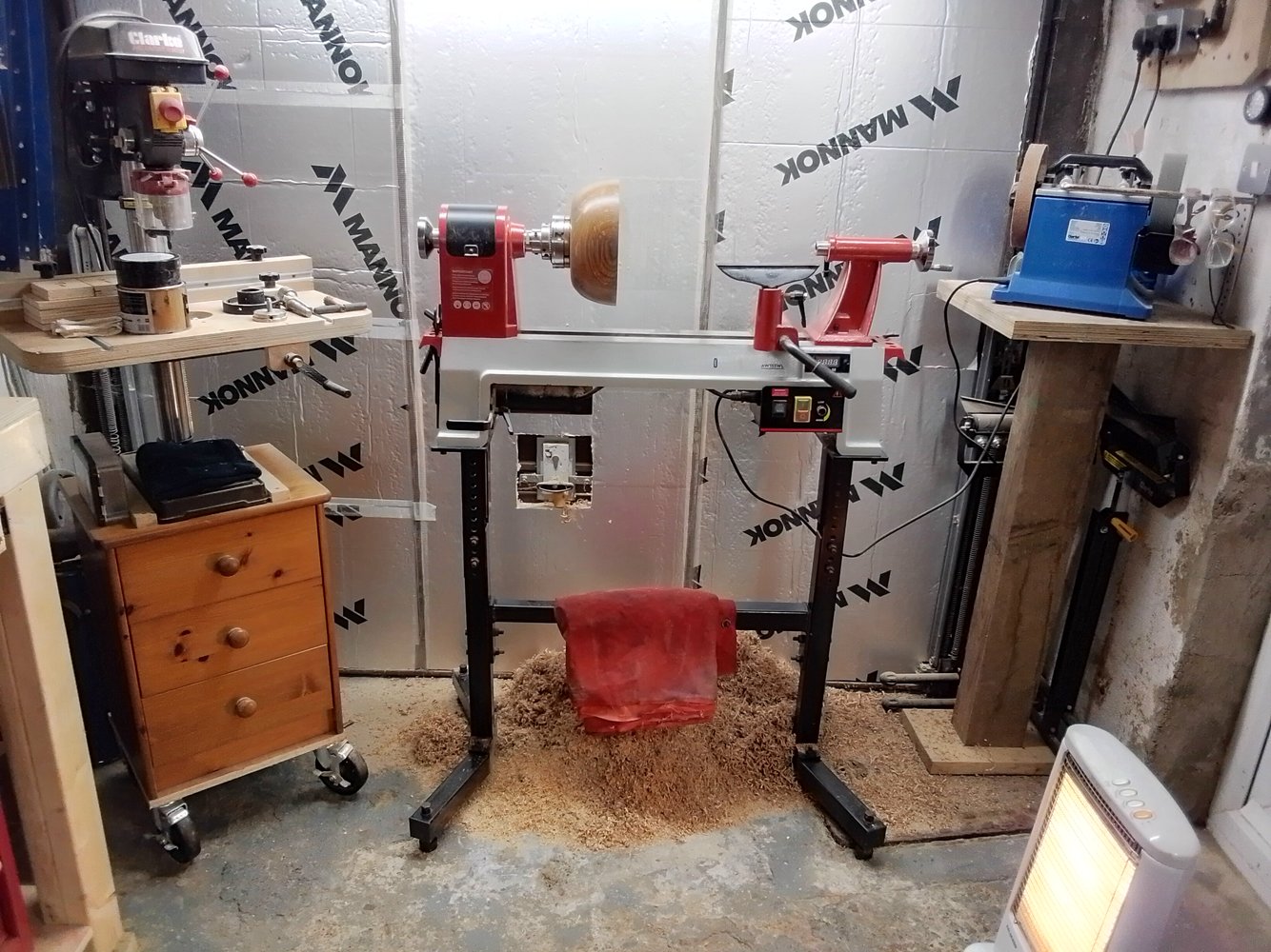 Moved the wood lathe in from the shed as the roof has a leak. OH donated a bedside cabinet that was a perfect height to use under the drill press. Again, it's not perfect but it keeps all the drill associated gear in one place. The grinder on the right is for sharpening wood turning tools but will be modified to have a drawer where all my Tormek grinding jigs can live: