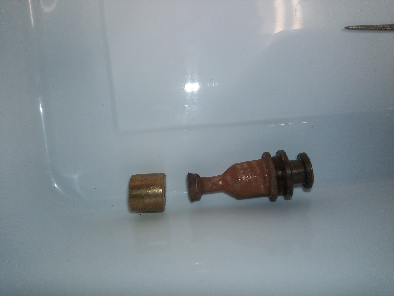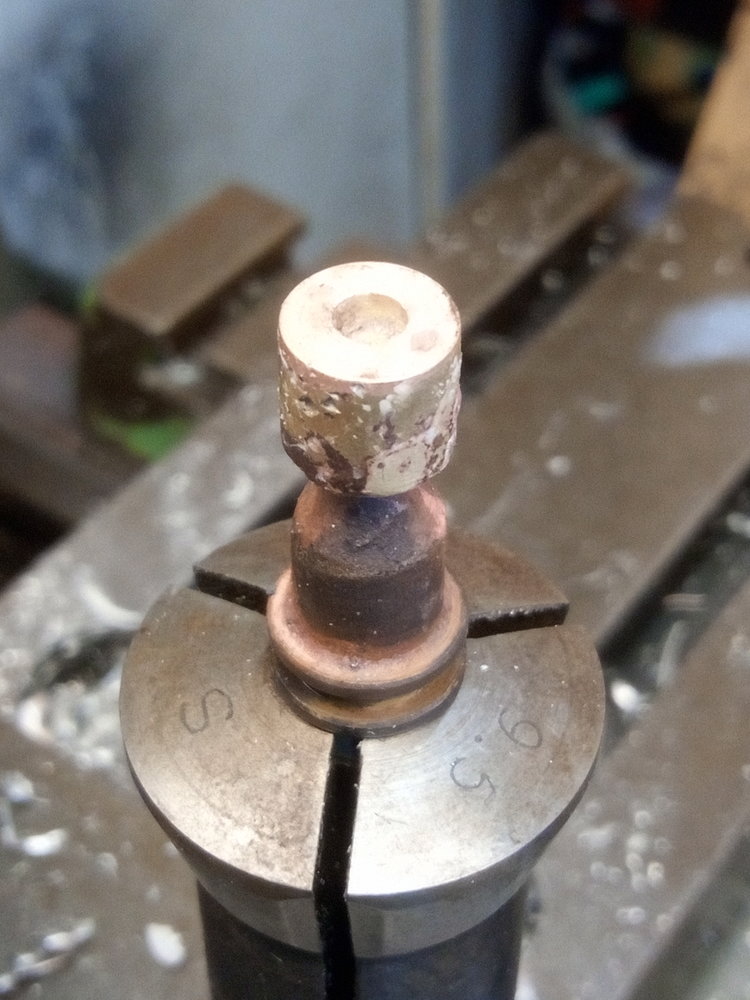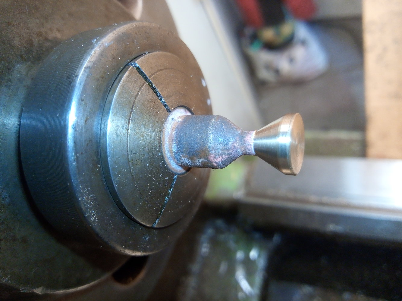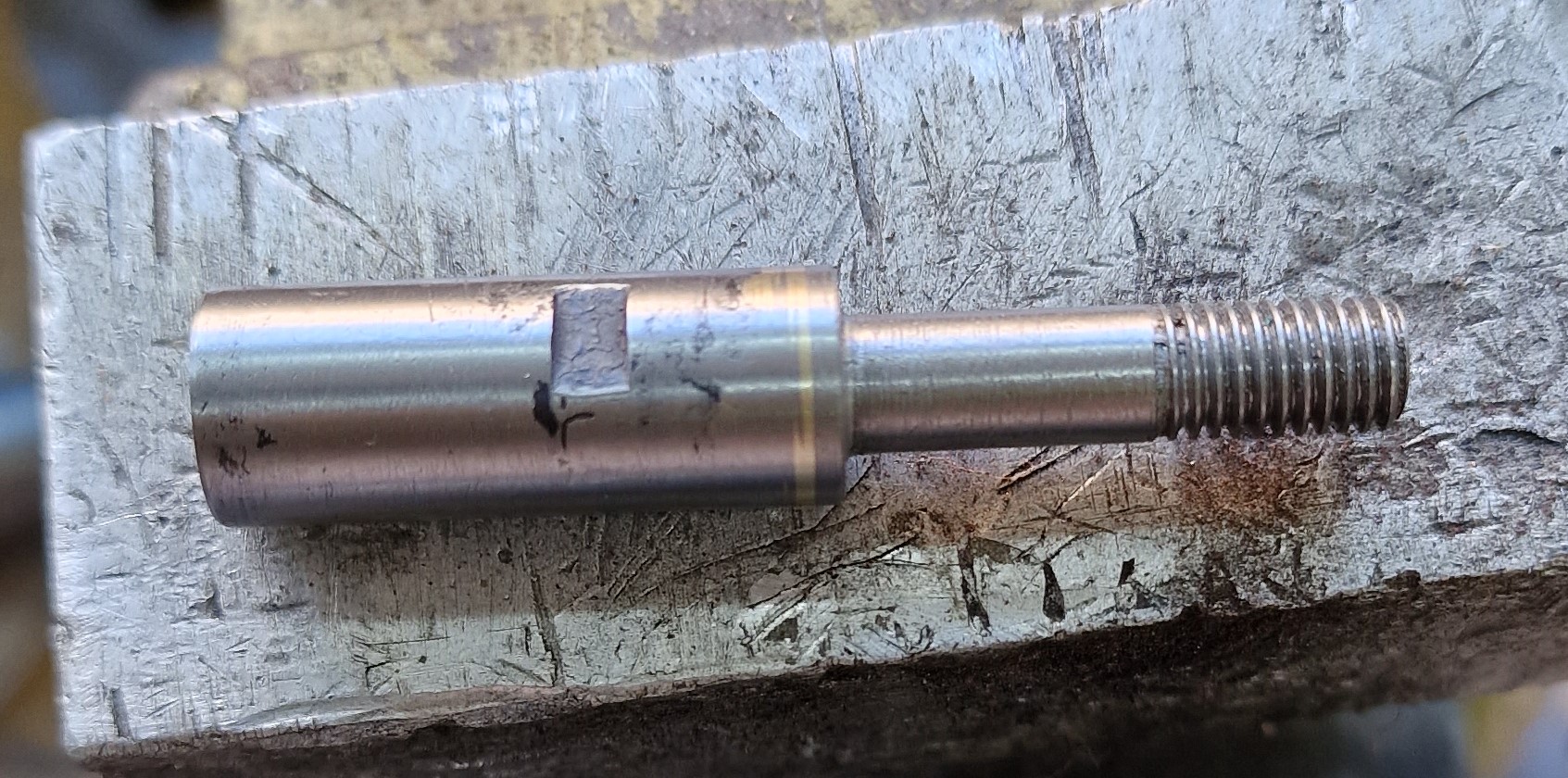 Cue some lathe work and silver soldering. I tuned the threaded part off, then drilled the body ready to tap it to screw another piece in. Only to discover that that had already been done and a poor bit of silver soldering had been resulted in the thread being slightly off-centre. The shaft had then been skimmed, but was still out of true and undersize.