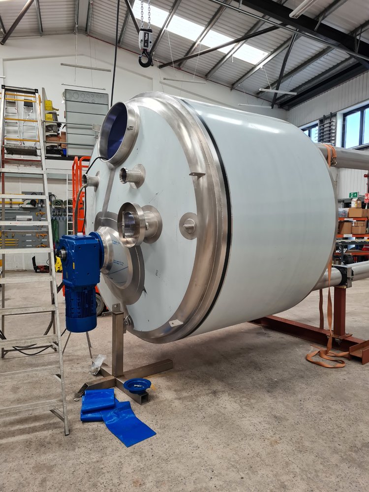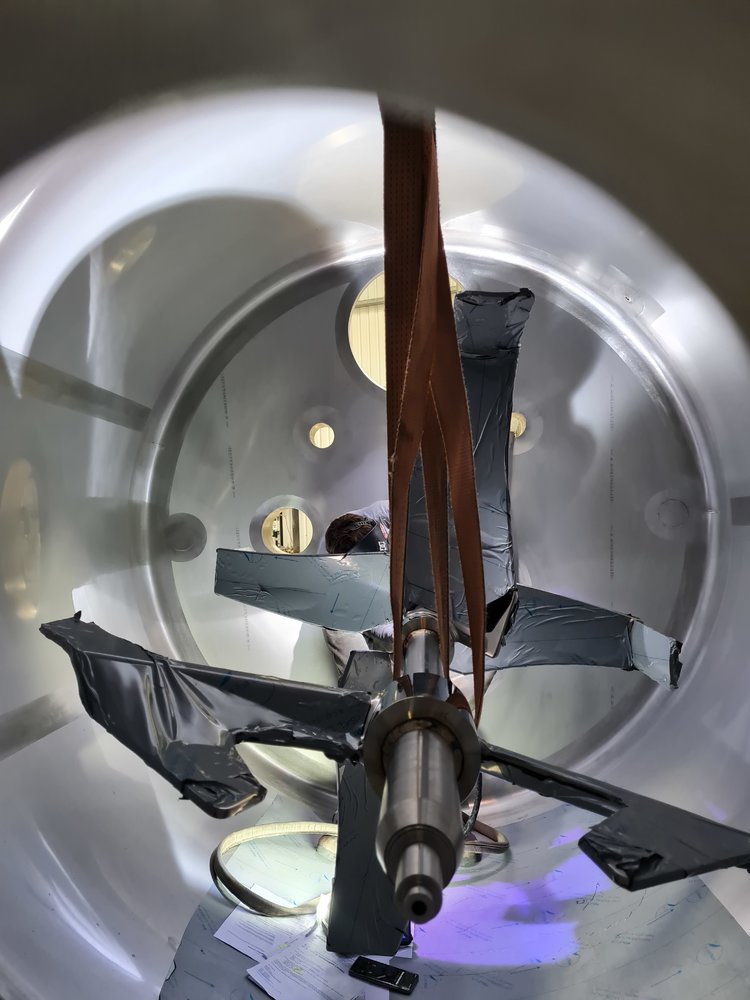 Agitators finally rocked up today, so installed one set. All passed through the manway in kit form, and paddles welded to the shaft inside, motor and box fitted on top. Just need to install the bottom bearings now, which means standing them up again... then lay down again for transport.