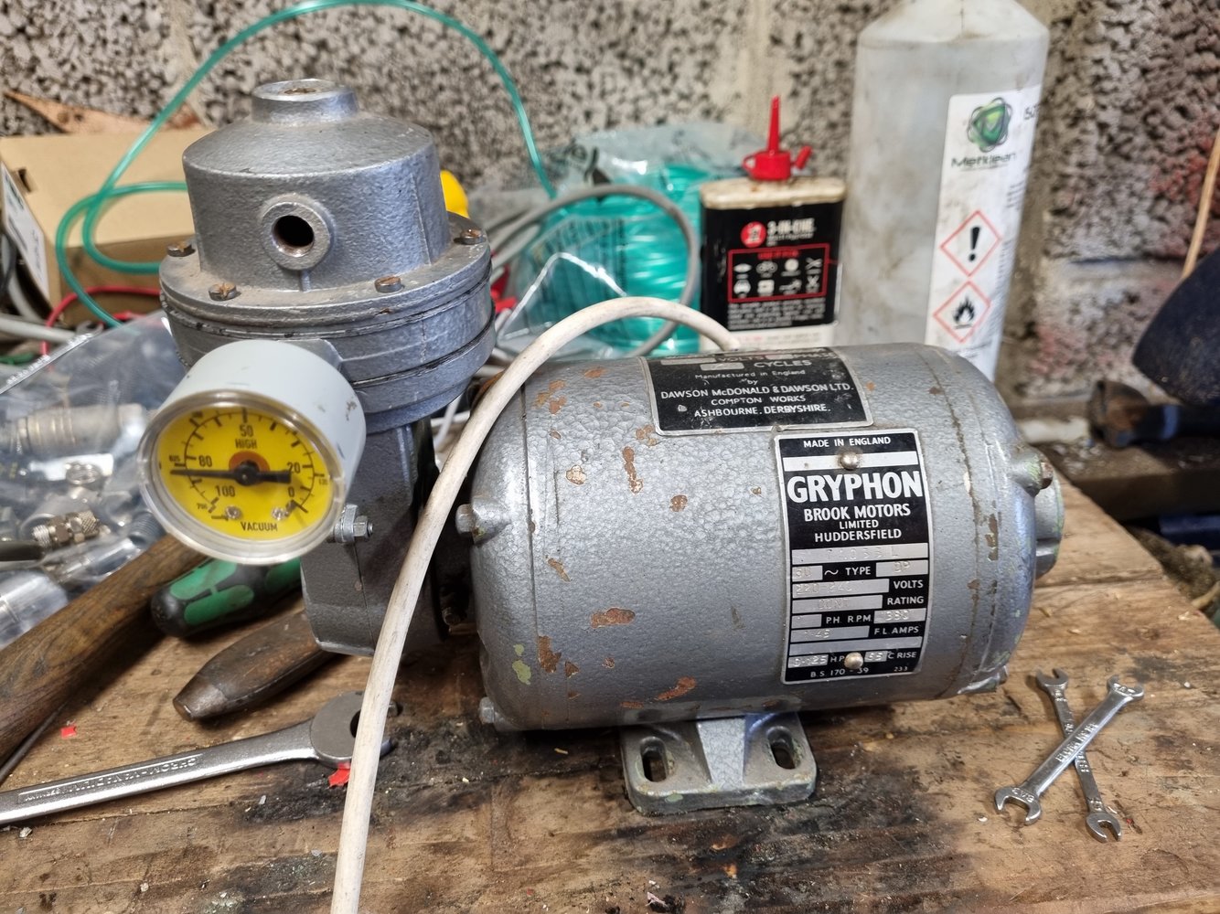 Tiny drop of light oil should keep them sealing tight, all back together and it easily pulls 625 Torr, which takes a few seconds to bleed back down to zero now. I put another gauge on the output and it makes it to 40psi before the PRV opens, not bad at all. No idea what it's rated for, where it came from or what it was used for, quality little unit though. There's a small leak where the diaphragm meets the casting, it's not a machined face so I might pull it apart again and see if a light skim on the lathe can get it to seal, maybe get a few more Torr out of it.