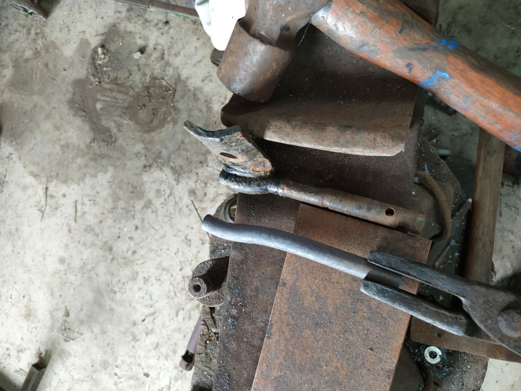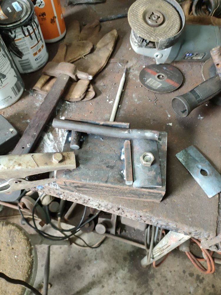 Looking at tine holders on the weekend, and the condition of the others, there was no way I was paying for 20 new ones so it was time to fire up the forge. They are a L shape, with a 16mm shaft with a bend in the end. The bend matches a curved piece of flat that matches the curve of the tine coil spring. This piece also has a flat area for the tines to bolt onto and they are welded together at an angle.