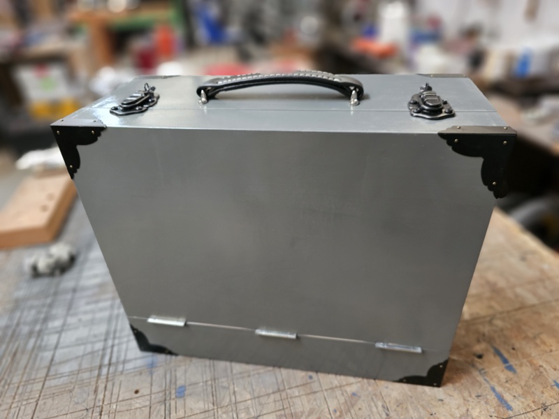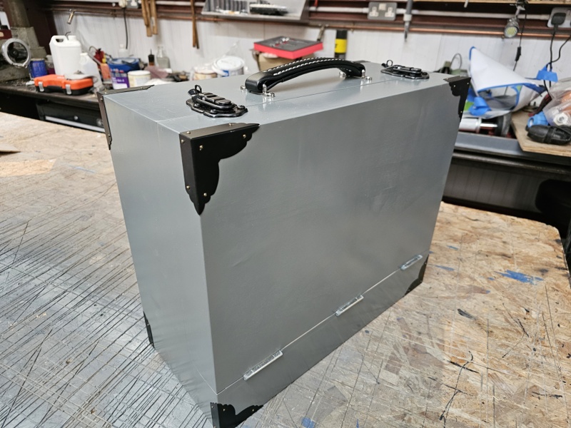 The handle and catches arrived from Pen Elcon, they supply bits for making cabs for the music industry. Look pretty bog standard to me. I already had some cheap corner protectors but they were antiqued so painted them satin black. I wish I had painted the hinges black two, I guess I still can.