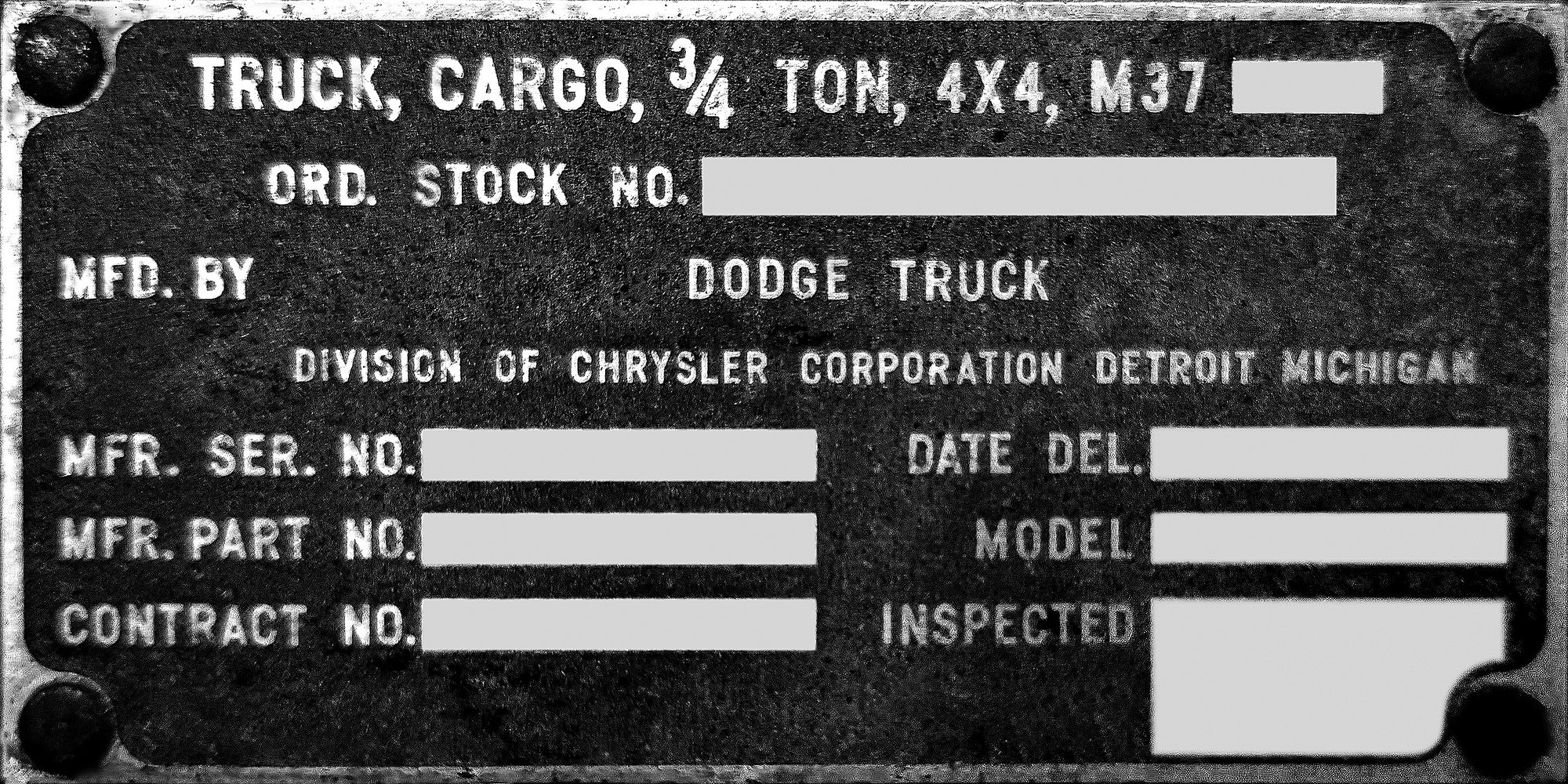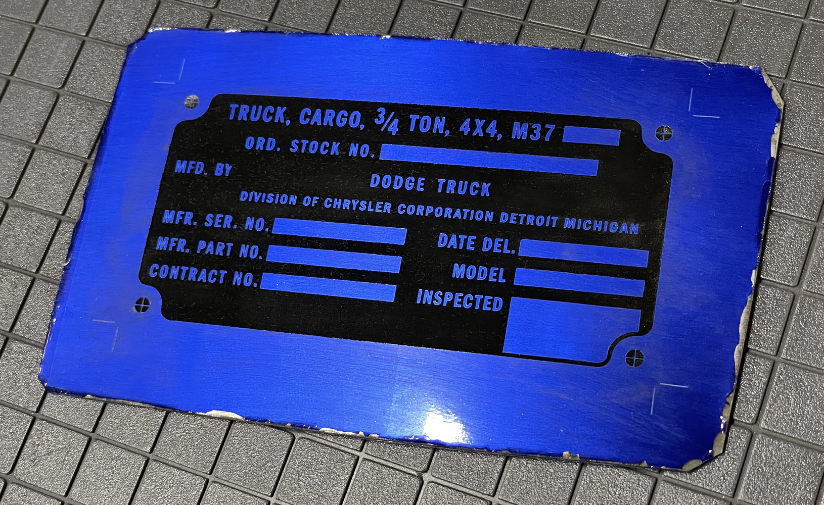 The ID data plate for my 1954 M37 was missing, and I could not find a proper reproduction plate, so I thought I'd try my hand at making an etched-aluminium facsimile that was as near as possible to the original plate.
