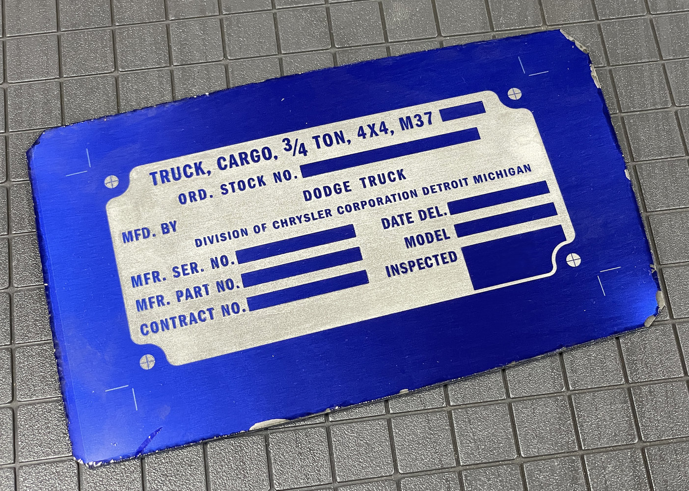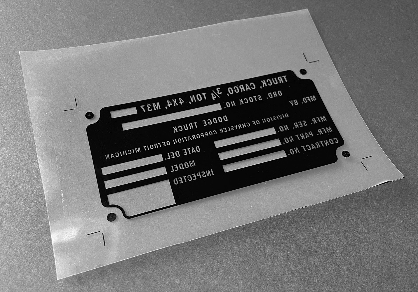 To start, I found a photo of an original data plate that would be correct for my truck and squared it up with Photoshop so that it could serve as a model: The plate is 4" wide and 2" high.