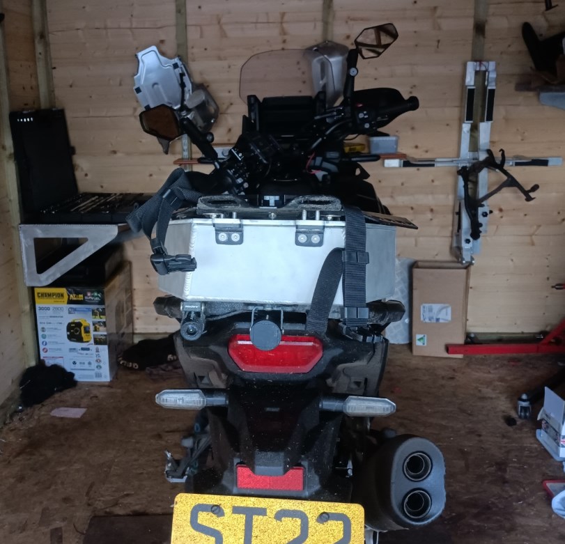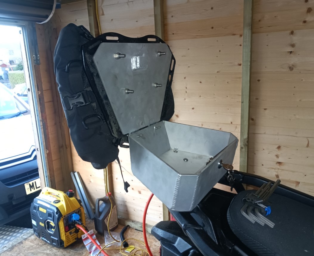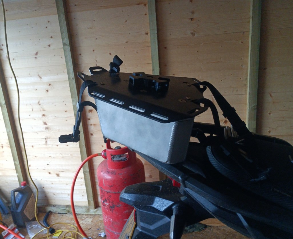 Made up an aluminium box to fit on the rear rack and fitted the rack plate I had previously made to the top of it.