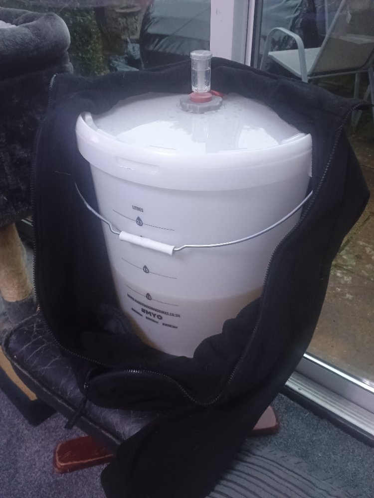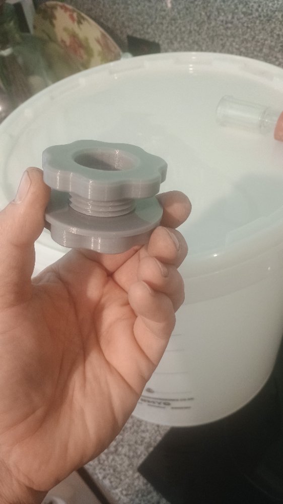 Drilled a 35mm hole in the bin lid and fitted a 3D printed adapter to take a bung and air lock.