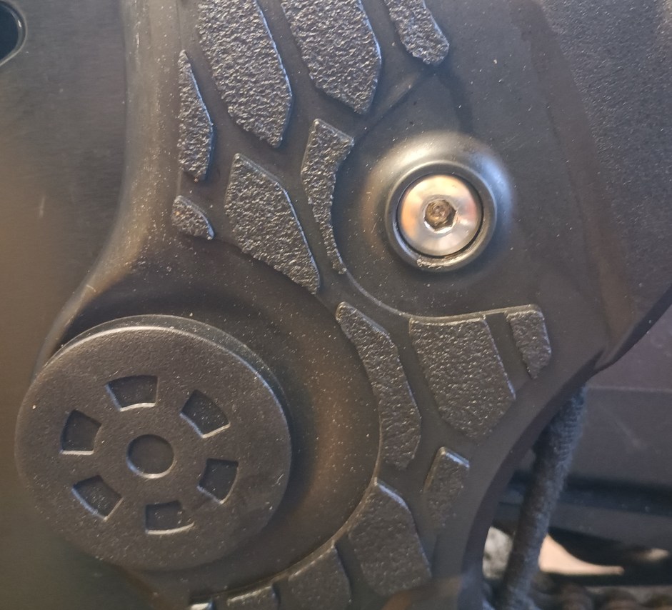 If you look at the two images at the screw in relation to the logo then it is tight, must just be a reflection in the shiny acetal.Not that one. The screw in question is the hex headed screw that is directly in front of the chain at the right side of the photo above. It doesn't seem to be sat down against the circular flange, unlike the other two similar screws that are visible.