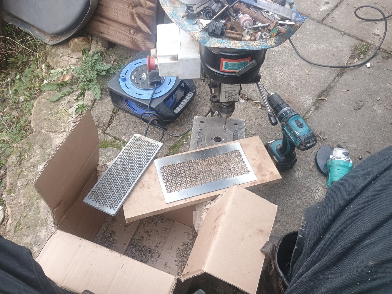 I must admit I'm impressed, that's come out really well. To attach it, can you cut out the old mesh and fit the new part on top with the same fixing tabs as the heating element cover?In the end I drilled all the holes. In the absence of a workshop it was a hand job on the patio. SWMBO was a bit put out as I'd said she could do it but I told her I'd hoped to freeze to death: