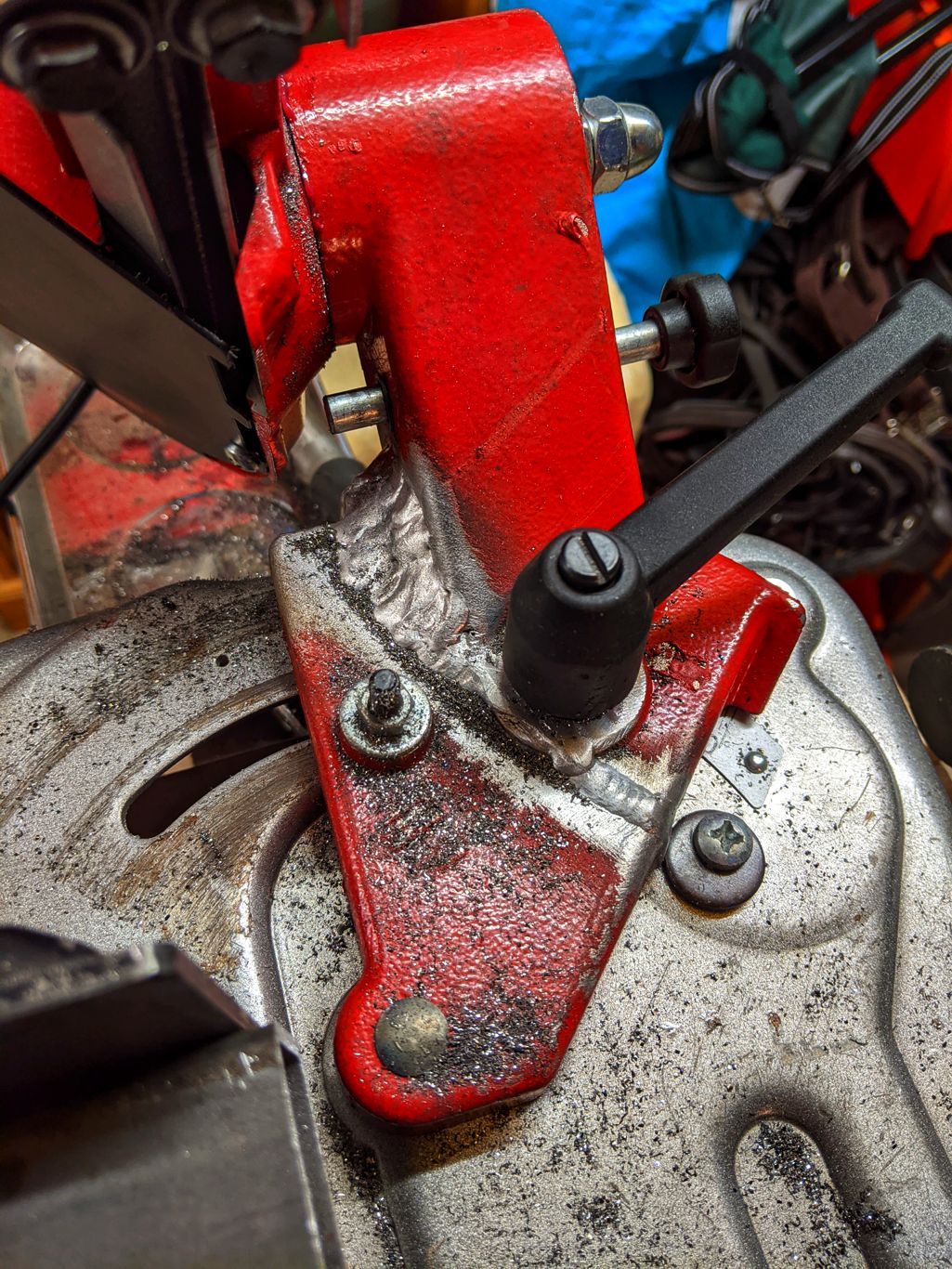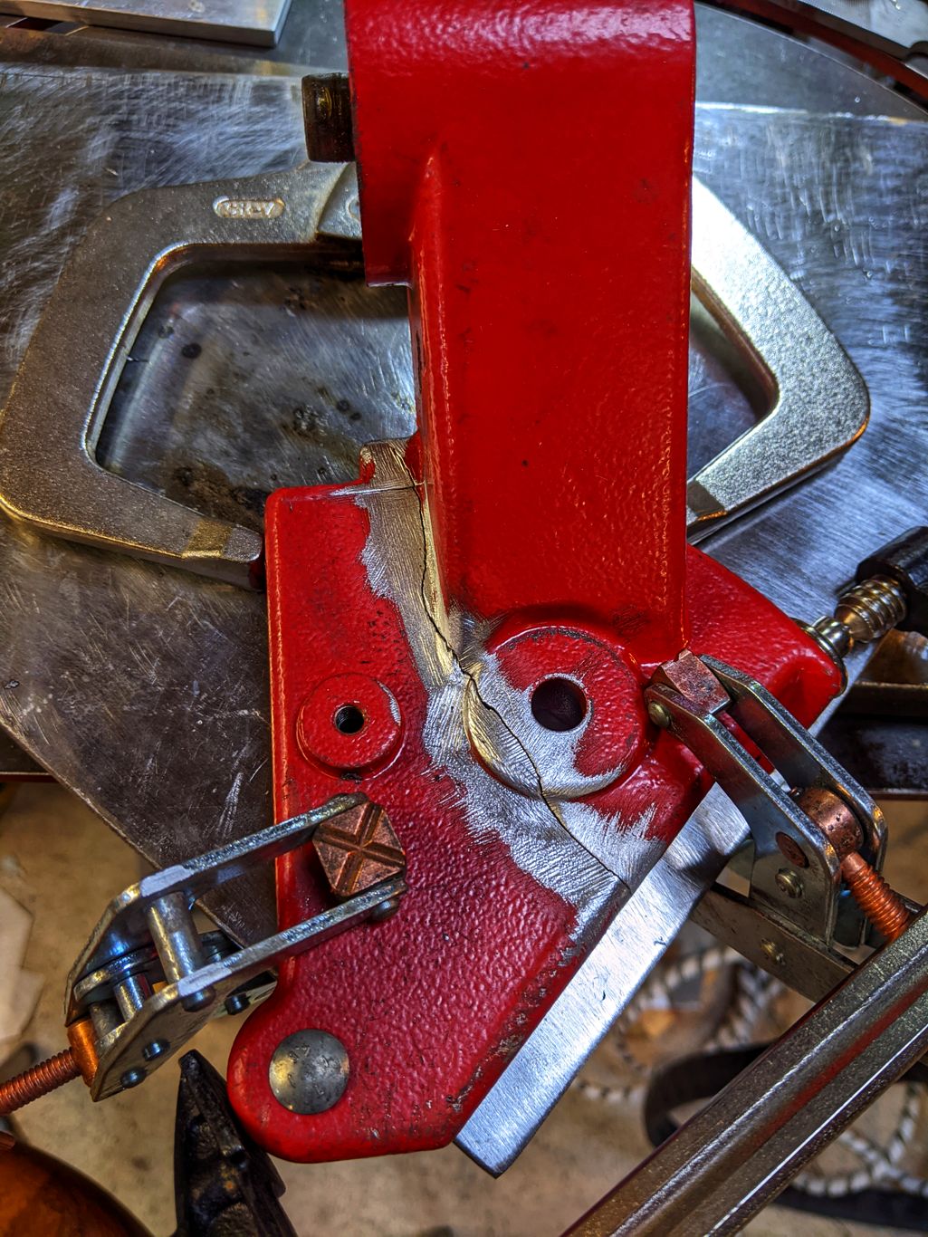 The bargain Sherman TIG206P meant that I could have a go at bodging a fix (alas my beloved Lorch MicorTIG is DC) before I can get hold oc a replacement part. Its about 1deg out vertically as I put way too much filler and heat into it but I'm hoping some filing and washers might fix that. A messy weld and got heaps contamination but its made a few cuts and held!