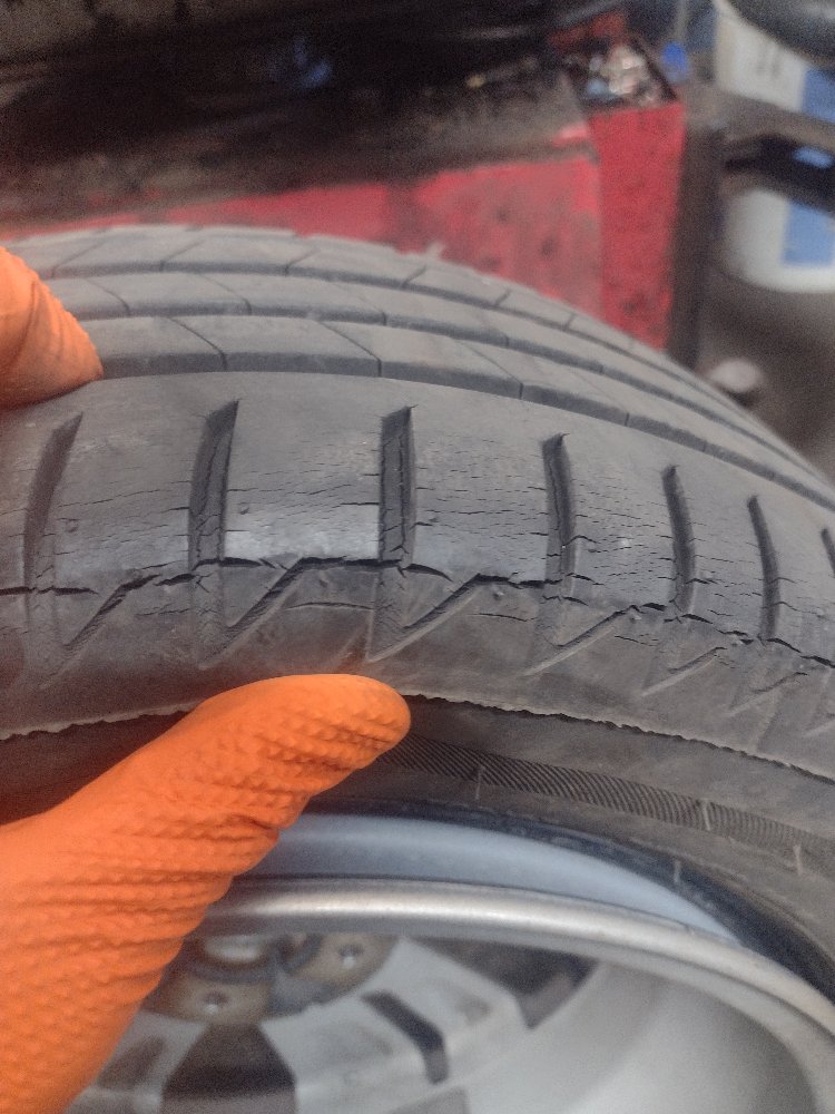 What brand were the tyres? they definitely haven't been looked after, some of it can be attributed to UV, but not the cracks in the centre or inner edges. Interesting to see the DOT codes, it wouldn't be the first time the tyres are significantly older than the rest of the car, usually caused by the seller not wanting to let it go with 'good' tyres on....