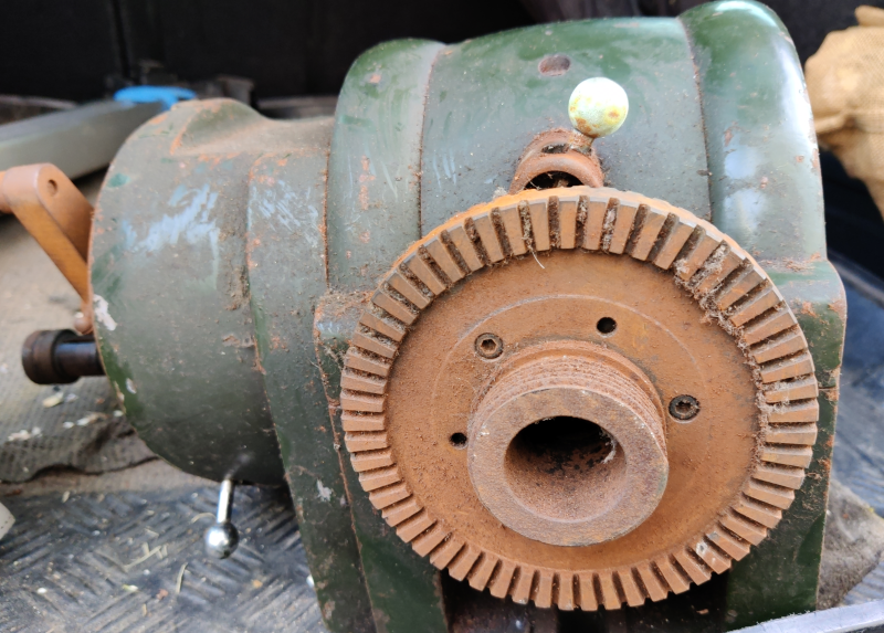 Rusty spindle nose. The direct indexing thing has two sides, one with 60 (I think) teeth and one with 56 teeth. I guess the 56 tooth side is most useful for dividing into 8 or 28? I can't imagine many times I'd need to divide into 7, 14 or 56! Centre height seems to be about 120 mm so probably 4¾".