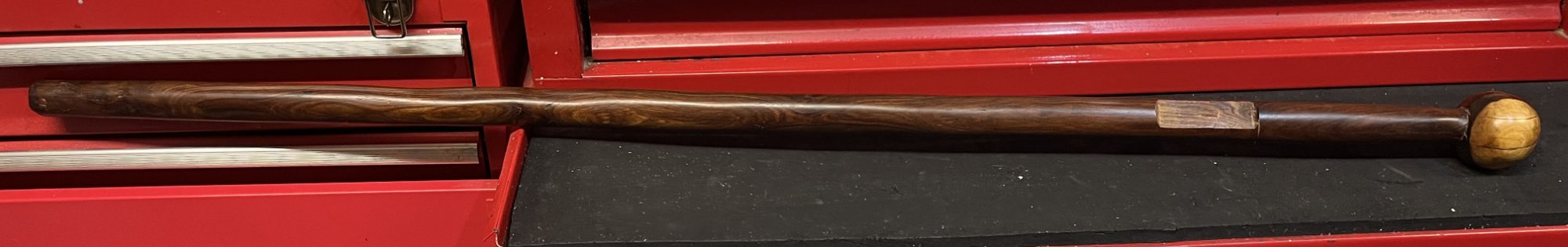 Fearsome in the hands of anyone who's made even a rudimentary study of martial arts edged weapon use. It works exactly the same way and I would take a walking stick against a knife any day, let alone one made of lignum, that's a serious bone breaker!Retrieved it, found in one of the boys (men) rooms, it had a brass plaque on it, which he took off and lost!, so after testing it on him, found it still works fine and produces yelps with low effort.