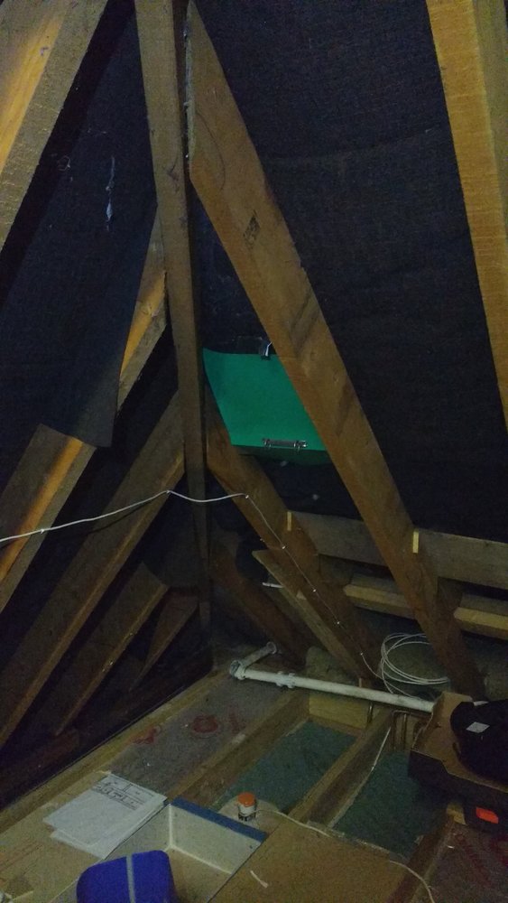 Now if i had a roof ladder i would have no problem doing the job myself but alas equipment and time are in short supply with an impending storm due in the next few hours. With that in mind i went into the loft and cut a couple of slots in the roof bracing that runs against and parallel to the ridge board directly below the loose ridge tiles. I cut a couple of battens made a gaffer tape dam on the end and filled it with 5 minitue epoxy then it was a matter of pushing it through the slots id cut and up onto the underside of the loose ridge tile. With a couple of screws through the side of the batten and into the ridge board the ridge tiles are a bit more secure than they were.