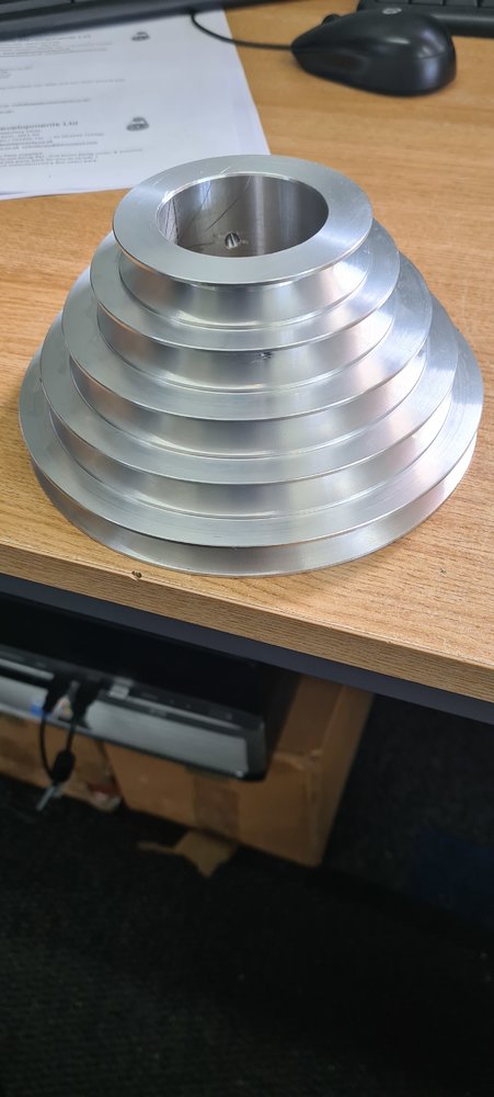 Thanks I will do. Like I said before, last night's research eventually revealed that their is a school of thought who genuinely cannot understand why anyone with a lathe would ever buy a pre made pulley system as opposed to just machining their own on their lathe and I also noticed a couple of companies offering pulley set ups designed to spec, built up in separate layer and connected with either grub screws and one had a kind of unique, tapered push-fit system for each step. Agro shield's solution might sound simple to him but you're dealing here with a novice metal worker and to me it defeats Elliotts purpose, from the moment I saw him I wanted to see what he is completely capable of so I don't want to ask him to dance right after he's been kicked in the shins. I do have a cheap pillar drill, but like all cheap power tools it's just a lowly and noisy facsimile of what it's intended to be and struggled sometimes right out the box, with 4 mm mild steel plate (which is what I need to drill. Elliott is part of a bigger picture of mine. He's currently in pieces, some in the house, some in the shed and even under the tarp for the night, 6 decades of dirt and several different paint jobs has created a bigger than expected project for me, everything is at different stages of being stripped now, cleaned, unpainted, de-rusted, repainted and now obviously the pulley problem. I think I'd rather pay the cash for a bespoke cast iron pulley system (even powder coat blue) than try and bodge the break with my limited skills, but ideally some middle ground would be preferable. I'll take some photos for Agro tomorrow in better light but I'm sure the dimensions are standard for the model, with the correct abutment fitted, over a 2" diameter, 1" thick bearing casing and a 16mm spindle within that!!! Cheers