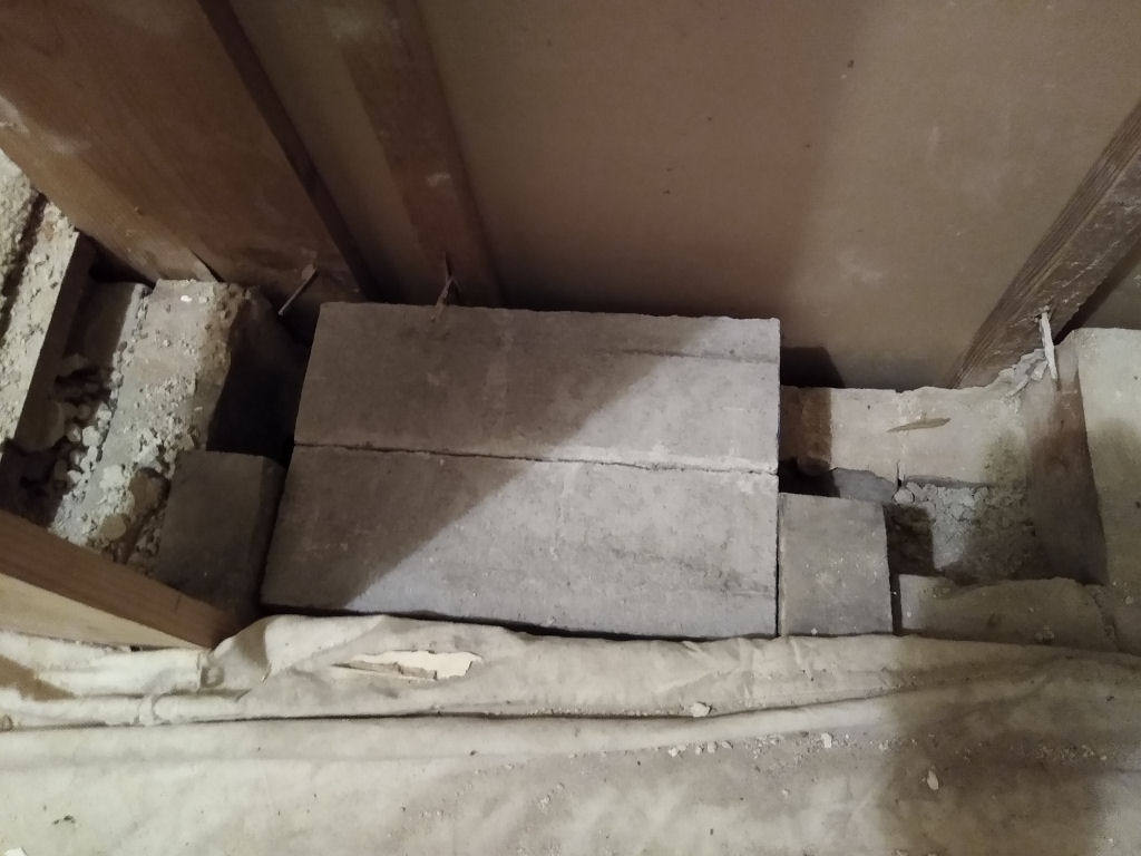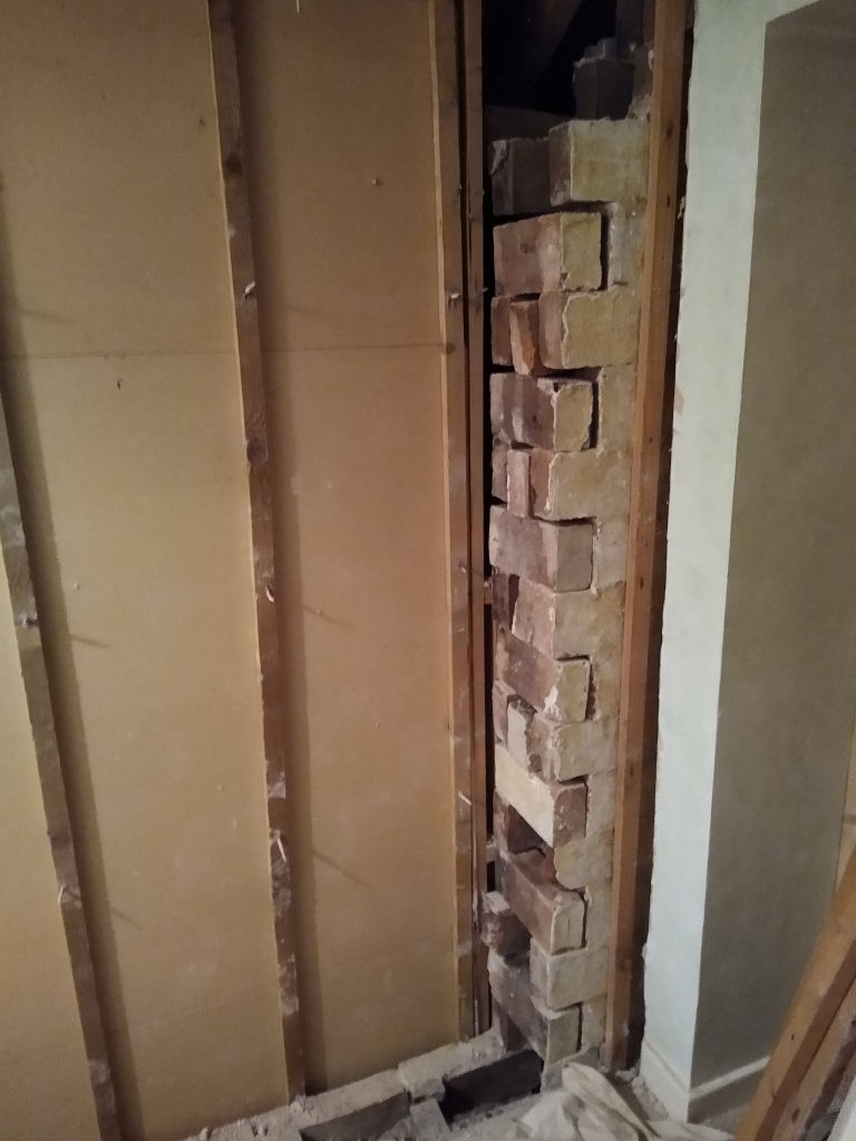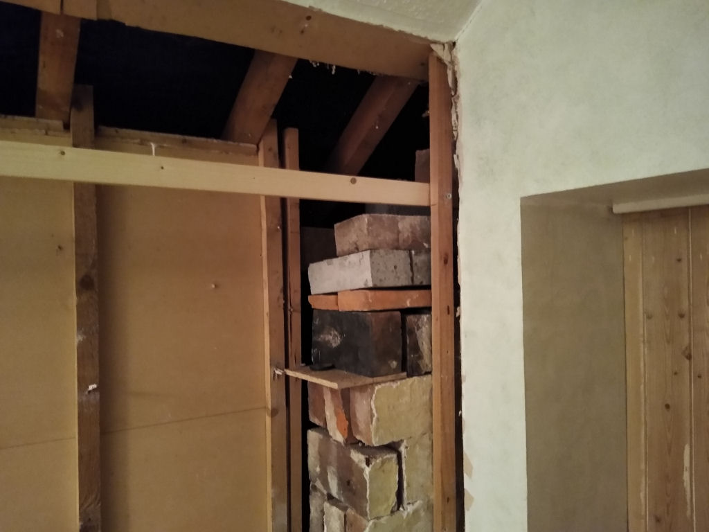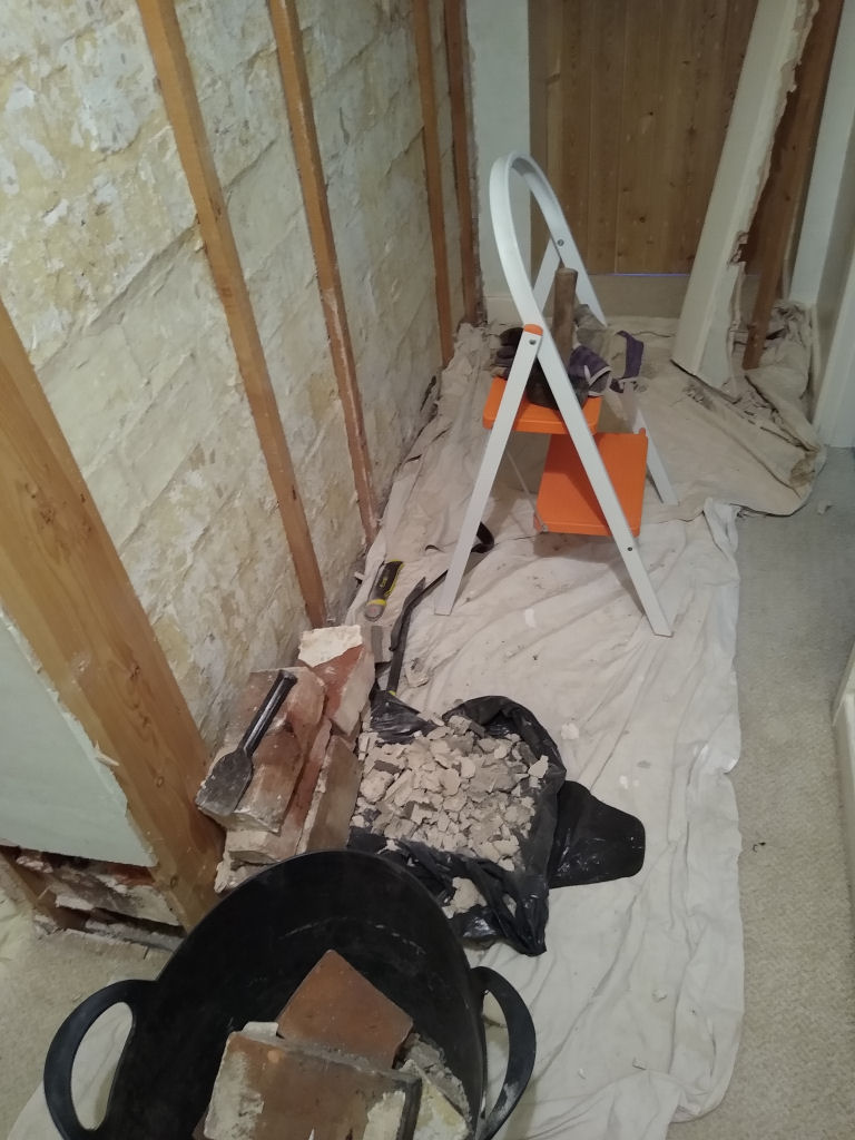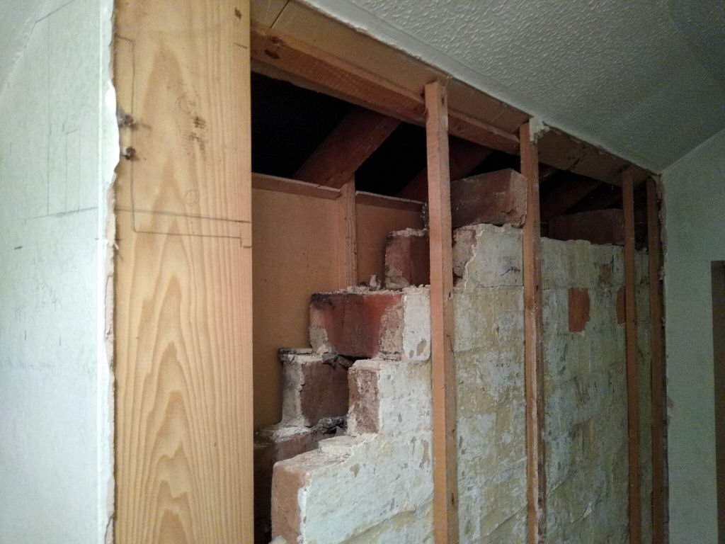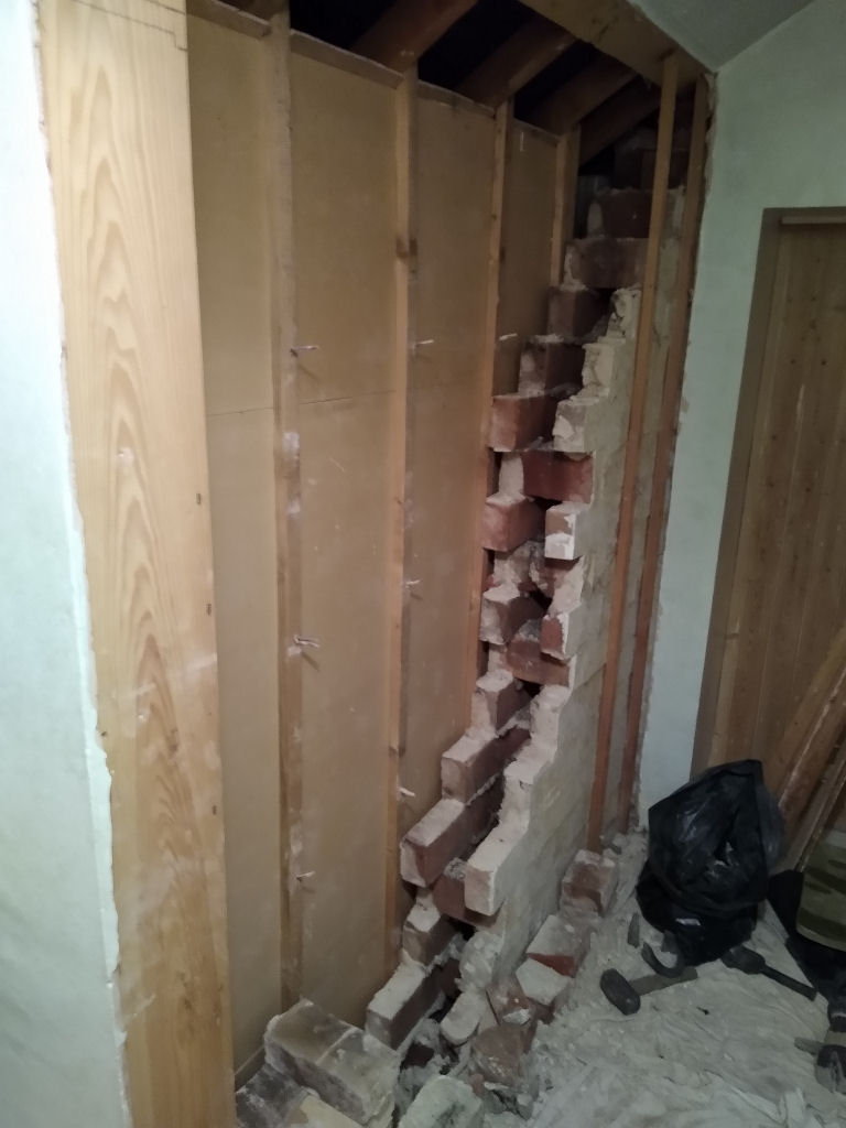 Then today I started removing some brickwork. Taking my time as it's a small space, boiling hot (with all the bedroom doors closed), and access up the stairs is narrow even before the props went in. Carrying buckets of bricks up and down is great fun .... not.