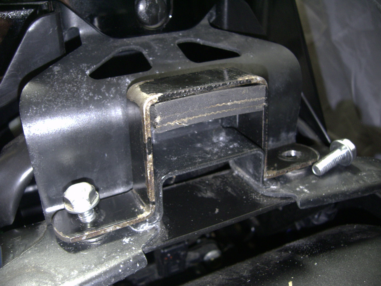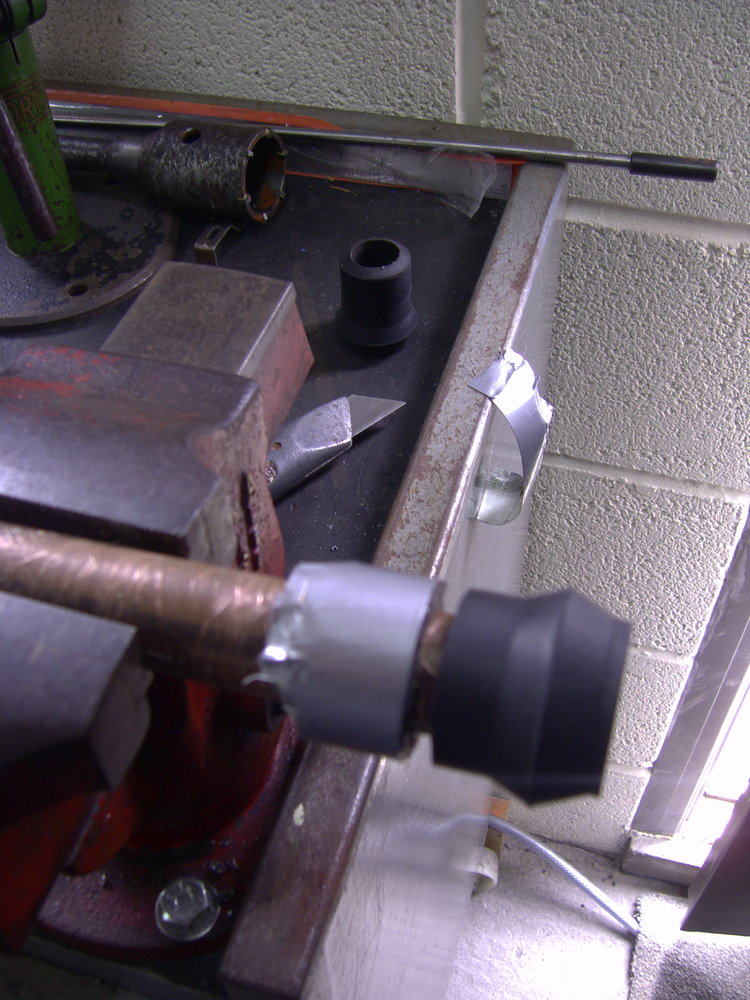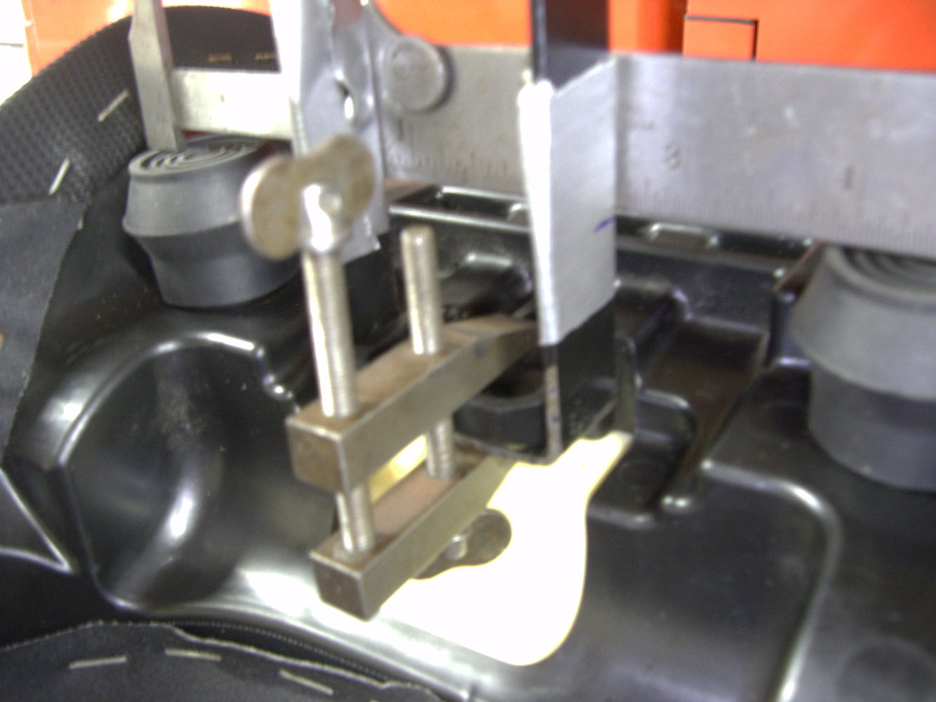 A few photos....... To cut the rubber cane feet without messing them up, I slipped then over a scrap piece of 22mm copper pipe in a vice. This made it easy to tape a line around the circumference, and press hard to cut through without distorting. I then bent a U-shaped bracket to locate the tongue of the seat, and mark it to allow for two height adjustments before bending and drilling the ears; then gluing in a 20mm thick spacer which can be used either over, or under the new bracket. Once fitted and checked, a shot of paint and job done.The lighting in the last photo shows what looks like a large gap, but there isn't; its actually hardly noticeable.