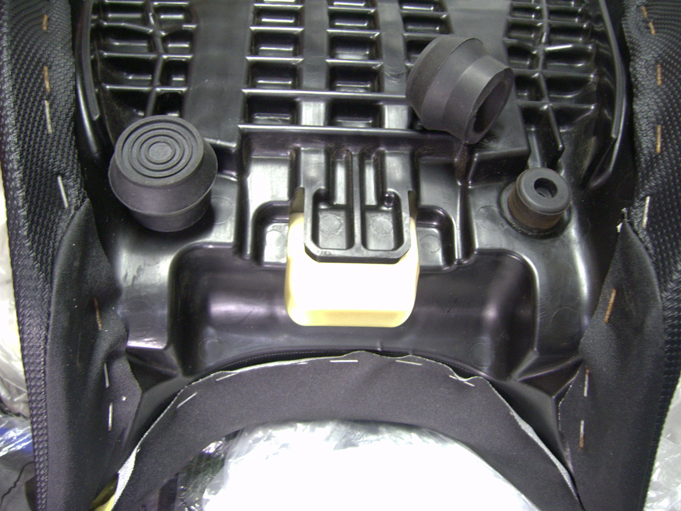 An afterthought.A little rainy day project for my nc750x bike. There have been a couple of videos showing a fix to change the slope angle on the seat to prevent sliding forward, which is an issue many have had. My solution was to cut and fit a couple of rubber walking stick feet on the existing bumpers to raise the front of the seat up about 20mm, and make an adapter bracket using the same bolts. So no permanent modification, and all is easily removed to put the seat back into stock configuration without damage.