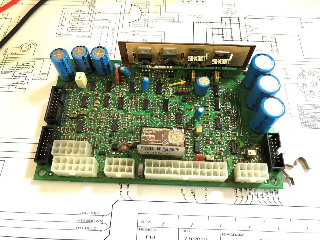 Regarding the issue on your Migatronic control board: when MOSFETs fail with a short-circuit, they often feed the voltage on the source/drain circuit to the gate, and this can destroy the gate drive logic. You may be able to confirm that the failed SOT3 item is a gate drive transistor by tracing the track from the gate of one of the MOSFETs. There may be another intact drive transistor for the other MOSFET ?