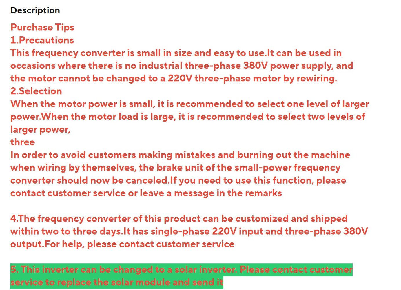 However, after browsing a little bit more, looking at different 220 to 380V VFDs, I came across the following types of warnings or cautions in SOME listings.